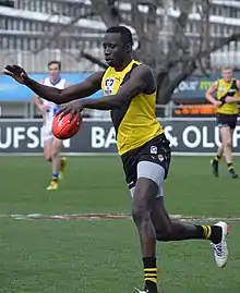 He first represented Richmond in the club's 2016 pre-season match against Fremantle.[11] He failed to gain selection at senior level as a result though, instead playing a majority of his season with the club's reserves side in the VFL.[12] There he played in a myriad of roles, including as a key defender, key forward and as a ruck.[13] He eventually made his AFL debut in Richmond's last match of the season, in round 23 against Sydney at the Sydney Cricket Ground.[4] Chol thereby became the fourth player of Sudanese descent (after Majak Daw, Aliir Aliir and Reuben William) to play senior AFL football.