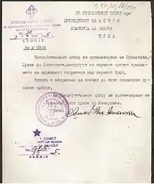 The first modern assembly of Macedonian clergy was held in the village of Izdeglavje near Ohrid in 1943.[9] In October 1944, an initiative board for the organization of the Macedonian Orthodox Church was officially formed.[1] In 1945, the first clergy and people's synod met and adopted a resolution for the restoration of the Ohrid Archbishopric as a Macedonian Orthodox Church. It was submitted to the Serbian Orthodox Church, which since 1919 had been the sole church in Vardar Macedonia. The resolution was rejected, but a later one, submitted in 1958 at the second synod, was accepted on June 17, 1959, by the Serbian Orthodox Church under pressure from the Socialist authorities. Dimitrija Stojkovski, a Macedonian, was appointed the first archbishop of Ohrid and Metropolitan of Macedonia under the name Dositheus II.[1]