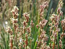 The robust grass-like sedge is rhizomatous and perennial, it typically grows to a height of 4 metres (13.1 ft) and a width of 2 m (6.6 ft). It blooms between August and March producing brown flowers.[5] It has rigid, terete and biconvex culms that are smooth and glabrous. The culms are 20 to 110 centimetres (0.7 to 3.6 ft) in length and 1 to 5 millimetres (0.04 to 0.20 in) in diameter. The narrow and erect inflorescence has an interrupted-oblong shape in outline forming dense clusters that are around 7 to 20 cm (2.8 to 7.9 in) long and with a diameter of 1 to 2.5 cm (0.39 to 0.98 in). After flowering an ellipsoid to obovoid shaped pale red-brown to bright orange coloured nut. The nut is smooth with a hispid apex with a length of 2.2 to 4 mm (0.09 to 0.16 in) and a diameter of 1.2 to 2 mm (0.05 to 0.08 in).[6]
