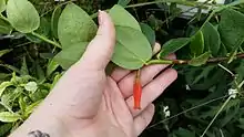Macleania insignis displays 3 cm tubular red orange flowers and dense shiny oval leaves. It can grow in a cloud forest (as an epiphyte) and as a terrestrial plant. The plant can spread out over several feet, and its roots form large, woody tubers that partially emerge above the soil surface in terrestrial plants. Macleania produces an edible fruit that is purple and lightly sweet.[5][6]