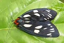 Macrobrochis gigas differs from congeners in the following morphological characters: orange head and collar; thorax black above with green metallic tinge and orange below; tegulae striped with orange; abdomen greenish black, the extremity and ventral surface orange; abdomen with white bands or lateral spots on the hind borders of each segment; forewing black with a green tinge, with a small white spot at the base, with a larger one beyond it, and a spot at the end of the cell and another below it; hindwing with the basal half white, the outer half black.[3][4] Mass aggregation and feeding behavior of this species adult and larvae observed in several sites in South India[5]