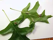 | Larva (top) and galls on red oak leaves (bottom) | |