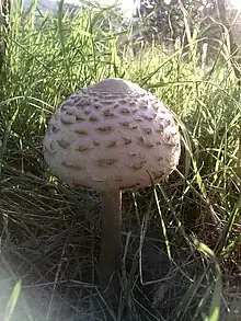 The height is 5 to 15 cm (2.0 to 5.9 in). The color of the mushroom is white to cream. The cap is convex to shield shaped,[1] is arched over with a raised center, 6 to 10 cm (2.4 to 3.9 in) in diameter, has a brownish center, and has ochre yellow to pale brown scales. The gills are white to cream. The stipe is smooth, cylindrical, has a bulbous base, and has a ring.[2] The spores are smooth, hyaline, and ellipsoid.[3] The spore print is white, cream, or yellowish.[1] The ring is whitish to white.[4] The flesh is white, fibrous, and does not change color.[5] The mushroom is saprophytic.[2] It is listed as a vulnerable species. The threat to this species is over-growing of ungrazed and unmowed meadows.[6] The species is similar to Macrolepiota procera, although the latter is bigger.[7]