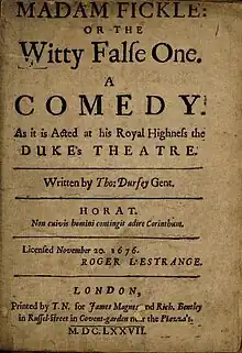 Madam Fickle; Or, The Witty False One is a 1676 comedy play by the English writer Thomas D'Urfey. It was first staged at the Dorset Garden Theatre by the Duke's Company.