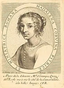 Maddalena Corvina (1607-1664) was an Italian portrait and still life painter and engraver. Corvina specialized in miniature portrait paintings. Living and working in Rome, the House of Medici were patrons.[1][2] She apprenticed under her uncle, Francesco da Castello. Anna Angelica Allegrini was a student of Corvina.[2] Works by Corvina are held in the Albani Library.[1] Corvina was the subject of a portrait by Claude Mellan in 1636.[3]