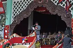 Prime Minister Nepal delivering a speech at Tundikhel the occasion of Democracy Day.