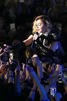 During her concert tours, the Madonnamania usually resurrect either because she visited for the first time a country or city, or because she hadn't been there for a long-time. With regard to the latter, when she toured with the Sticky & Sweet Tour after 17 years of absence in South America, promoter Arthur Fogel said that the continent was "over-the-top amazing for Madonna", so "it was Madonna-mania" ended.[27] A similar situation occurred in 2012 with the MDNA Tour in Mexico.[28] Also, for her debut performance in Russia (2006) or Colombia (2012).[29][30]