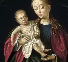 The representation of the Christ Child is probably derived from Rogier van der Weyden, given the playful attitude and amiable facial expression. As Petrus Christus may not have had access to Rogier's work, the influence was likely second-hand, perhaps by the intermediary of the paintings of Hans Memling.[3]