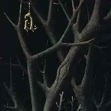 The wilted and thorny tree may be a dark representation of the biblical "Tree of Knowledge". Art historians see it as a metaphor for original sin, that will remain dead until redeemed by the second coming of Christ. The iconography maybe based on the Ezekiel 17:24: "...and all the trees of the field shall know that I the Lord have brought down the high tree, have exalted the low tree, have dried up the green tree, and have made the dry tree to flourish".[21][22]