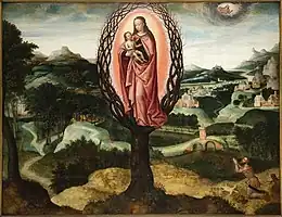 Madonna of the Dry Tree or Our Lady of the Barren Tree[1] is a small oil-on-oak panel painting dated c. 1462–1465, attributed to the Early Netherlandish painter Petrus Christus. Itt shows the Virgin Mary and the Christ Child standing on a disembodied dead tree trunk. The painting's imagery is unusually dark and dramatic and shows a encircled woman within folds of black and withered branches that may represent a crown of thorns.