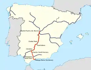 ![]() Madrid-Málaga high speed rail line in red | ||||||||||||||||||||||||||||||||||||||||||||||||||||||||||||||||||||||||||||||||||||||||||||||||||||||||||||||||||||||||||||||||||||||||||||||||||||||||||||||||||||||||||||||||||||||||||||||||||||||||||||||||||||||||||||||||||||||||||||||||||||||||||||||||||||||||||||||||||||||||||||||||||||||||||||||