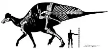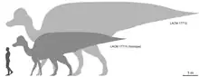 Magnapaulia is noted for its great size and the tall profile of its tail, which had elongated chevrons and vertebral spines like those of Hypacrosaurus.[3] Its size was estimated by its original describer as between 15 m (49.2 ft) and 16.5 m (54.1 ft) long, with a body mass of up to 8 metric tons (8.8 tons).[3] Prieto-Márquez et al. provided a smaller estimate of around 12.5 metres (41 ft), still among the longest ornithischians and representing the largest known lambeosaurine, based on the largest known specimen (LACM 17712) with a humerus estimated at 80.3 cm (2.63 ft) in length.[2]
