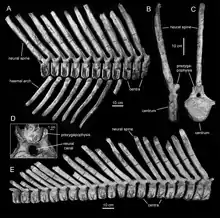 The redescription of 2012 established two autapomorphies, unique derived traits: the presence of chevrons at the tail base that were four times as long as the vertebral centra; and the possession at the tail base vertebrae of front joint processes, prezygapophyses, the inner bases of which formed a bowl-shaped depression that extended upwards into a deep trough on the front surface of the spine.[2]