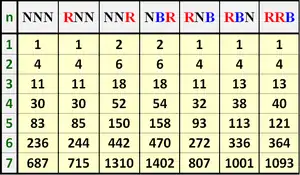In contrast, solutions for the semi-colored variations (where one or more posts are neutral) and the fully free variation are solved by more complex recursion relations. The RBB(n) and RRB(n) puzzles can be solved using the following pair of optimal algorithms:
