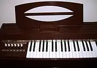 - 665: Tabletop Model, Three Octave, Six Major chord, Six Minor chord, Brown Plastic Case with faux wood - c. 1970s