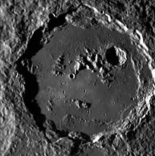 Magritte is a crater on Mercury, near the south pole. This crater was likely created by an impact event, as evident by its circular depression.[1] Its name was adopted by the International Astronomical Union in 2012, after the Belgian painter, René Magritte.[2] Magritte is one of several craters on Mercury named after famous artists. Per the Working Group for Planetary System Nomenclature, all Mercury craters are named after an artist who was famous for more than fifty years who has been deceased for more than three years at the time the crater is named.[3]