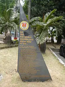 According to the authorities, the attack killed 58 people, including 32 journalists.[23][24][25][26] However, the body of 58th victim was never found.[27] Reporters Without Borders announced that at least 12 of the victims were journalists, making this the deadliest such incident in the history of news media.[28] The National Union of Journalists in the Philippines originally estimated that a total of 20 journalists were killed, including an undisclosed number of NUJP members.[25] The Philippine Daily Inquirer later updated the number of journalists killed to 34.[8]
