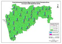To fight climate change and droughts in Maharashtra, the forest department planned 33 crore tree plantation drive.[7] It was three-month long tree plantation drive across 36 districts from 1 July to 30 September in the State of Maharastra.[8][9] The State over achieved the target by planting more than 33 Crore saplings.[10] In total, Maharashtra Forest Department planted, 52 crore trees between 2017 and 2019 and the survival rate remains to be 81%.[11]