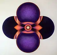 The inspiration for Mahirwan Mamtani's conception of "Centrovision" is derived from the manifestation of tantric doctrines. Emanating from the centre toward the outside, his forms are akin to the mandala concept, the visual manifestation of which are based on the axiom of microcosm versus macrocosm. The feeling of procreation is evoked by the rhythmical arrangement of symmetrical, curvilinear organic forms, the roots of which could be traced in the form of the female, the symbol of Shakti, the supreme cosmic energy. Instead of having a flux of light, the paintings are permeated with the whispering tonal values achieved through the integration of colour hues with soft light which becomes the essential ingredient for the modulation of pulsating circular forms.