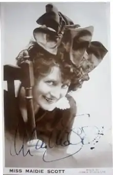 By 1904 she was known professionally as Maidie Scott. One reviewer in Leeds described her performance that year in the musical comedy The Girl from Japan as: "delightfully dainty and demure... [She] holds the hearts of all the male members of the audience in willing thralldom... Her songs... are rendered with vocal skill and sweetness which make an audience turbulent for encores... [As a dancer] her marked originality, graceful and artistic movements proclaim her as an artiste of high attainments."[2]