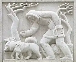 The reliefs show the efforts of postal carriers delivering mail to the "four corners" of America. The East and West reliefs flank an entrance on 9th Street near Market Street. The North and South reliefs flank an entrance further south on 9th Street near Chestnut Street. Noted photographer and former Philadelphian Carol M. Highsmith photographed the reliefs as part of an assignment for the U.S. General Services Administration.[1][2][3][4]