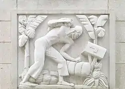 A fairly traditional 1940s scene represents the East. A postal carrier is dressed in a double-breasted uniform jacket and small round cap. He is bent over, like all the subjects in the reliefs, in this case over the front bumper of car and a mailbox attached to a fluted column. With his right hand he reaches toward the mailbox and he carries a mail pouch slung over his left shoulder. Another fluted column and the leaves of a tree complete the scene.[5]