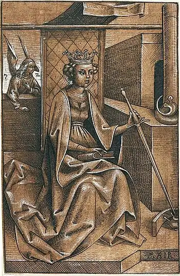 Some engravings survive in conventional black on white examples, and ones printed on paper "prepared", or tinted with watercolour (as in the Sampson and Delilah illustrated), and sometimes painted highlights as well (as in the St Catherine at top). The colours added by brush include white, yellow and red.[16] Another impression of the Sampson and Delilah, in Vienna, is printed on brown prepared paper with brushed-in highlights in white and yellow.[17] The same treatment is given to impressions of a Nativity dated 1499, in the National Gallery of Art,[18] and also the British Museum.[19] The same print is illustrated here in a conventional black on whte impression in New York (with others in Vienna and the British Museum).[20] Altogether, impressions of fourteen of his prints on prepared coloured paper have survived.[21]