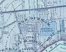 The area, which was one of the most populous sections of the township of Bergen,[8] was referred to as Maisland for 135 years,[9] when in the year 1803, Maisland became known as New Durham, which later on became part of North Bergen, New Jersey.[10] Maisland today constitutes the same area as New Durham did, which is bounded roughly by the beginning of Union Turnpike, Bergen Turnpike, and the Tonnelle Avenue Station of the Hudson Bergen Light Rail.[11] Within its vicinity during Maisland's frame of time was the Three Pigeons Tavern,[12] which stood at the southern fringe of Maisland near the intersection of Tonnelle Avenue and Hackensack Plank Road,[13] and the "Frenchman's Garden". This garden in Maisland, which later became Machpelah Cemetery,[14] was the early source for Lombardy poplar Populus nigra, which spread across the United States.[8][15]
