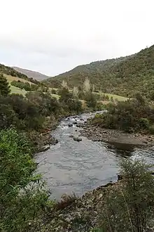 The Maitai River (also known as the Mahitahi River)[1] is the largest river in the city of Nelson, in the north of New Zealand's South Island.[2] The river stretches from the Bryant Range, situated to the east (inland) of Nelson, where it flows towards the city, flowing west through the heart of the city and into the Tasman bay at Nelson Haven.[2] The catchment of the river covers some 9000 hectares, and has two branches in the upper catchment, the north meets a dam, where the south travels west into the middle catchment, from where it takes its final journey through the urban area of the city before meeting the ocean.[2]
