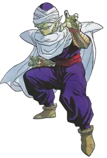 Five years later, Piccolo teams up with Goku to defeat his older brother Raditz.[43][44] Piccolo is able to defeat Raditz, but at the cost of Goku's life, as Piccolo's move Makankōsappō cuts through both Saiyans.[45] Piccolo's subsequent conversation with the dying Raditz, in which he reveals that the Dragon Balls can resurrect, is broadcast. Piccolo remains amazed with the powers from Gohan and trains him in preparation to fight against the two Saiyans who will invade Earth.[46][47] As the year goes by, Piccolo starts to change as he spends time training Gohan, slowly beginning to bond with him. When the Saiyans arrive a year later, Piccolo discovers his heritage from the planet Namek. In the fight against Nappa, Piccolo sacrifices himself to protect Gohan from the attack, resulting in the deaths of both himself and Kami.[48] After the Saiyans are defeated, Gohan and the survivors travel to Piccolo's homeworld, Namek, to revive those who died against the Saiyans with the Namekian Dragon Balls. In the meantime, Piccolo trains in the afterlife with King Kai.[49] Piccolo is resurrected on planet Namek to help Goku and others defeat the evil Frieza. He takes this time to merge with the beaten Namekian called Nail, giving Piccolo a power increase.[38] The power increase allows him to go head-to-head with Frieza's second transformation.[50] However, the plan fails as Frieza reveals the full extent of his powers.[51] In Frieza's following fight with Goku, who tries charging a Genki-Dama to defeat him, Piccolo assists him alongside Gohan and Krillin.[52] Once Frieza emerges from the impact of the Genki-Dama unscathed, Piccolo is severely injured by Frieza with a shot to the chest.[53] Piccolo is later teleported off the planet to safety on Earth and, after regaining consciousness, declines to return to a new version of Namek as he wishes to protect Gohan and become stronger while remaining on Earth.