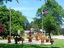 A roadside memorial fountain with a statue of Jesus and three angels in Conneaut, Ohio.