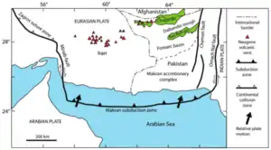 In the Makran region, the Arabian Plate subducts beneath the Eurasian Plate at ~2-4 cm/yr. This subduction is associated with an accretionary wedge of sediments which has developed since the Cenozoic.[1] To the west, the Makran Trench is connected by the Minab Fault system to the Zagros fold and thrust belt.[2] To the east, the Makran Trench is bounded by the transpressional strike-slip Ornach-Nal and Chaman Faults, which connect to the Himalayan orogeny. The Makran Subduction Zone is often split into two segments: the east and west. The Sonne fault divides the two. [3] Though largely much quieter than many other subduction zones, studies reveal that the Makran Trench may be capable of very large earthquakes, even extending into the magnitude 9 range. [4]
