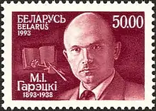 Maksim Haretski (18 February 1893 – 10 February 1938; Belarusian: Максі́м Іва́навіч Гарэ́цкі, Russian: Макси́м Ива́нович Горе́цкий), also known as Maksim Harecki and Maksim Goretsky, was a Belarusian prose writer, journalist, activist of the Belarusian national renewal, folklorist, lexicographer, and professor.[1] Maksim Harecki was also known by his pen-names Maksim Biełarus, M.B. Biełarus, M.H., A. Mścisłaŭski, Dzied Kuźma, Maciej Myška, and Mizeryjus Monus. In his works he often appeared as Kuźma Batura, Liavon Zaduma.