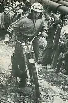Born in Otley, West Yorkshire, England, Rathmell first contested the FIM European Championship in 1970 before finishing runner up to Mick Andrews in the 1971 championship,[2] a year in which he also won the Scott Trial for the first time. Though rarely off the podium in 1972 the championship was a repeat to the previous season, followed by a 3rd-place finish on the factory supported Bultaco for 1973. In 1974 Rathmell almost switched camps from Bultaco to Ossa but found himself facing legal action from Bultaco for breach of contract.[3] Sticking with Bultaco for 1974 worked out for Rathmell as he won the FIM Trans America Trials Championship. He did however switch to Montesa for the 1975 season for the first year of the FIM Trial World Championship and added world round wins in Belgium, Poland and the United States and finish 3rd in the championship. A Runner up position to Bultaco rider Yrjo Vestarinen in 1976 and a 3rd place in 1977 were to be Rathmell's best attempts at recapturing the title on the Montesa.[4] For 1978 a Suzuki ride could only yield a 16th-place finish after which Rathmell rounded out his international career back with Montesa through the 1982 season.[5] Malcolm Rathmell Sports Limited opened in the UK in 1991 as an Aprilia importer and is currently the sole UK distributor for Sherco Motorcycles.[6]