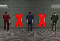 ![]() A scene showing one of the rules explained in Male Restroom Etiquette: adjacent urinals should be avoided | |