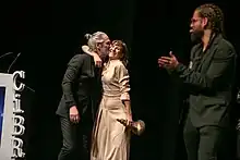 Malena Alterio receiving a Best Actress award at the closing gala of the 15th CiBRA Festival on 12 November 2023 accompanied by brother Ernesto.