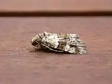 The wingspan is 15–18 mm.[3] Antennae of male minutely ciliated. In male, head, thorax and abdomen ochreous white. Abdomen has two dorsal black tufts. Forewings with ochreous white basal and costal areas, with a slight fuscous tinge. The outer area, which extends from the apex to center of inner margin, dark purplish fuscous and crossed by the irregularly-waved whitish postmedial line, which becomes pure white towards inner margin. A diffused dark somewhat dentate submarginal line and a marginal series of short dark strigae present. Hindwings are pale fuscous. Ventral side of forewings fuscous, with pinkish ochreous costal and outer areas. Ventral side of hindwings pinkish ochreous, with cell spot and curved postmedial line.[4]