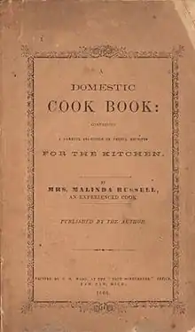 Malinda Russell (ca. 1812 – ?) was a free black woman from Tennessee who earned her living as a cook and published the first known cookbook by a black woman in the United States. The book is historically significant, as it shows that black Southern cooking was not solely the domain of poverty cooking, but provides evidence of a sophisticated cosmopolitan skill with complex dishes.[1]
