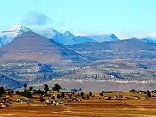 The range forms a high alpine basalt plateau up to 3,400 m (11,200 ft) in height. It is located between Butha-Buthe District in Lesotho and the Free State Province of South Africa. The highest point, 3,482 m (11,424 ft) high Thabana Ntlenyana, is located in the north-east of the range. It is the highest peak of Southern Africa, and the highest in Africa south of the Kilimanjaro.[2] The 3,291 m (10,797 ft) high Namahadipiek, the highest mountain in the Free State, is also part of the Maloti Range. The mountains form a continuous upland area of rounded peaks with incised deep valleys on the flanks which drain into the Senqu River. Snow and frost may be found even in summer on the highest peaks.[1]