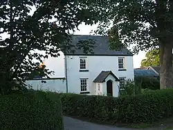 The building is constructed of rendered brick with a slate roof in two storeys and with a symmetrical two-bay front. In the centre is an open gabled porch. The windows are 12-pane sashes. At the rear is a large stairlight.[1]