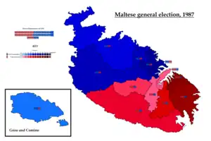 General elections were held in Malta on 9 May 1987.[1] Although the Nationalist Party received the most votes, the Malta Labour Party won a majority of seats. However, in accordance with the modifications made to the electoral system following a similar outcome in the 1981 elections, the Nationalist Party was awarded an extra four seats in order to give them a parliamentary majority.[2]