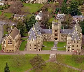 Aerial view of main college building (right) and chapel (left)