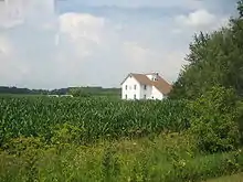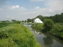 The Malvern Roller Mill is a country grist mill located in Whiteside County, Illinois along Old Clover Road. The mill building sits about 300 feet (91 m) from the present-day roadway, Felton Road, which was rerouted in 1992. The mill is near the small northeastern Whiteside County community of Malvern, about nine miles (14 km) northeast of Morrison, Illinois. The mill building sits on the south bank of Rock Creek, a tributary of the Rock River, and to its northeast is a stone faced dam. The dam stretches the 80 to 90 feet (24 to 27 m) across the Rock Creek, it is about 5 feet (1.5 m) thick and was reinforced with concrete during the 1950s. The 1858 mill building is of studded wall construction. The rectangular shaped building is 26+1⁄2 feet (8.1 m) by 38 feet (12 m).[5] To the west of the mill building is a circa 1890 Pratt truss bridge.[5]