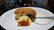 Mamón is a very light chiffon or sponge cake known for its soft and fluffy texture. It is traditionally baked in crenelated tin molds which gives it a characteristic cupcake-like shape. It is typically slathered in butter and sprinkled with white sugar and grated cheese. Mamón is commonly eaten for merienda.[1][4] In the Visayas regions, mamón is known as torta mamón, torta Visaya (or torta Bisaya), or simply torta. Although the name is derived from Spanish torta, "cake", in some Philippine regions torta could also mean "omelette". The Visayan versions are traditionally denser and greasier in texture. They were traditionally made with lard and use palm wine (tubâ) as the leavening agent.[2][5]