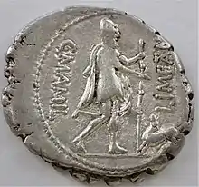 The Mamilii traced their nomen and origin to the mythical Mamilia, the daughter of Telegonus, who was regarded as the legendary founder of Tusculum and the son of Ulysses and the goddess Circe. This origin was referred to on a coin of the gens, the obverse of which depicts the head of Mercury or Hermes, the ancestor of Ulysses, and the reverse Ulysses himself, clad in the humble disguise he assumed to avoid being recognized by the suitors of Penelope.[3][4]