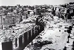 In response to the announcement of the United Nations Partition Plan, Arab mobs stormed Mamilla Street on December 2, 1947, ransacking and setting fire to 40 Jewish-owned stores.[14] Jewish merchants fled the area, which then came under heavy bombardment during the 1948 Arab–Israeli War.[14] With the cessation of hostilities, the area became a no man's land dividing the Jordanian-occupied Old City from Jewish West Jerusalem, until a truce was signed in 1952.[17] In the 1950s, poor Sephardic immigrant families and tradesmen took up occupancy in the derelict buildings, and workshops and auto-repair garages replaced the former stores.[16][17][11]
