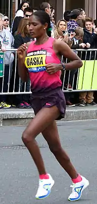 She posted a time of 2:26:33 hours to win the Houston Marathon in January 2011, completing an Ethiopian sweep of the top two with Ashu Kasim.[14] She was runner-up at both the Bolder Boulder and the Bay to Breakers races, later going on to win for the first time at the Freihofer's Run for Women.[15] Her biggest achievement that year came at the Frankfurt Marathon, where she bettered the course record by nearly 90 seconds with her time of 2:21:59 hours.[16] She came ninth at the 2012 Dubai Marathon, although her finishing time of 2:24:24 was among her fastest performances.[17] She defended her title at the Freihofers' Run for Women, finishing some distance ahead of runner-up Ashu Kasim.[18] This marked the start of a dominant run on the American road circuit, where she won the Bolder Boulder, Lilac Bloomsday Run, Bay to Breakers, Peachtree Road Race and Boilermaker Road Race all in one season.[4] She returned to defend her Frankfurt Marathon title, but was beaten into third, while her compatriot Meselech Melkamu took the win.[19]