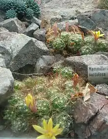 Mammillaria surculosa is a species of flowering plant in the cactus family Cactaceae, native to north eastern Mexico, where it occurs in extremely isolated patches at altitudes of 950–1,200 m (3,120–3,940 ft).[4] It is registered as “Endangered” by the IUCN Red List.[1] Growing to 10 cm (3.9 in) tall by 50 cm (20 in) wide, this tiny plant forms colonies of spiny stems with relatively large, lemon yellow flowers in spring.