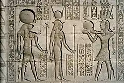 Major temples inhabited by a divine triad could be completed by a peristyle-surrounded mammisi, in which the goddess of the triad would give birth to the son of the triad itself.[1] The son, whose divine birth was celebrated annually, was associated with the Pharaoh (even in the hierogamy scenes on the walls).[1]