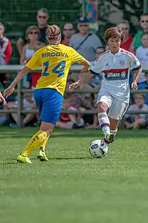 Finally, at age eight, she followed in his footsteps and joined the local club team, Sekimae SC, where he played. Her talent was recognised early on, and she was invited to train with the older boys.[7] The club was originally called 'Sekimae Boys Soccer Club', but because Iwabuchi became the first girl to join, they renamed the club to 'Sekimae Soccer Club'.[8][9] A notable figure she was teammates with in her youth is well-known Japanese actor Ryo Ryusei,[10] who commented years later that "she would be dribbling past boys with ease" from an early age and was one of the reasons he gave up on being a professional footballer as he watched her play and realised he would not be good enough.[11]